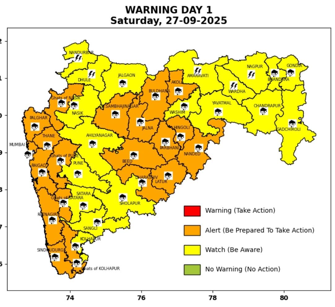 मराठवाडा ; जालना, संभाजीनगर, बिड, परभणी, हिंगोली, नांदेड, लातूर, धाराशिव या सर्वच जिल्ह्यात मुसळधार ते अतीमुसळधारेचा आँरेंज अलर्ट जारी करन्यात आला आहे…